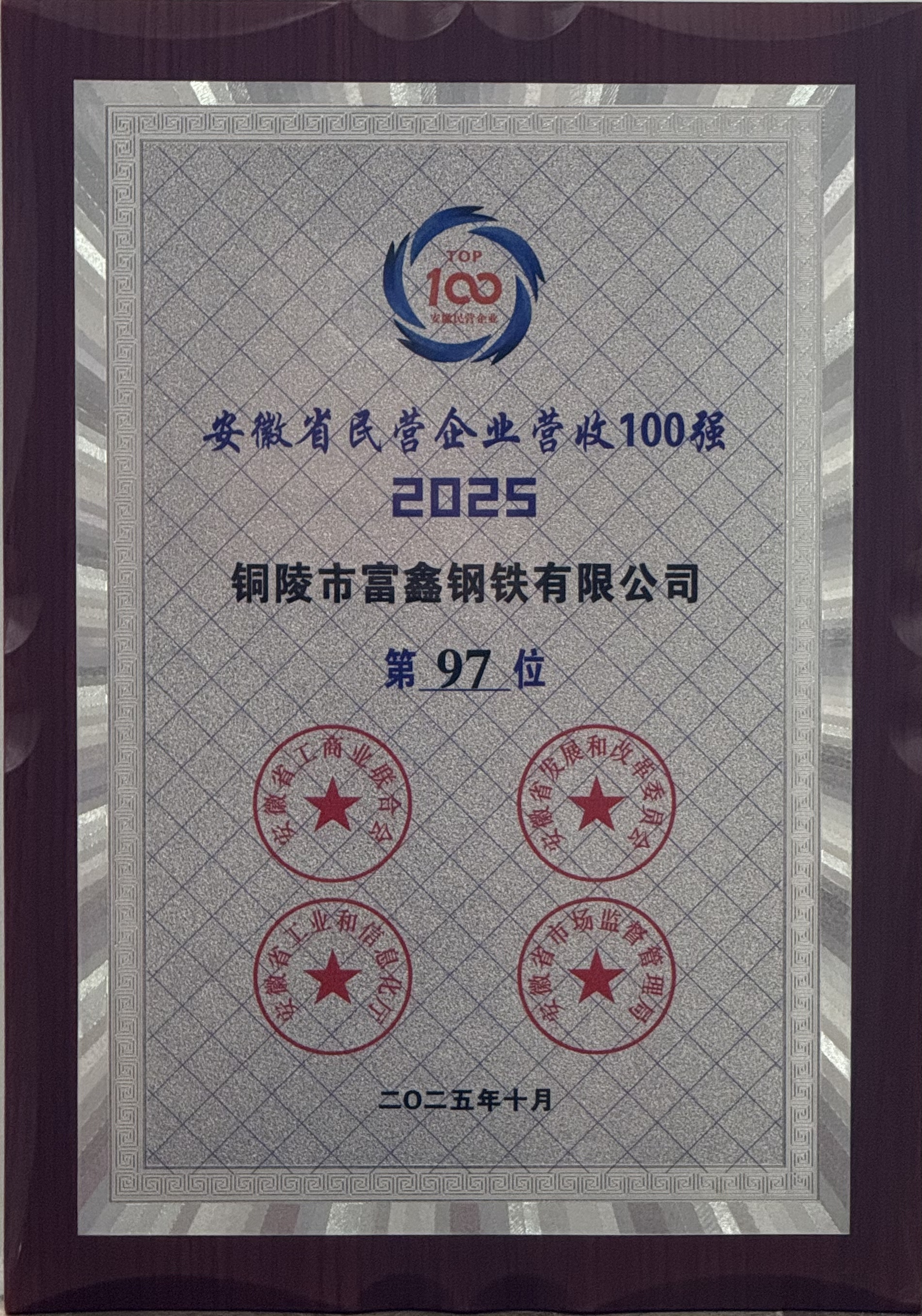 富鑫钢铁坚持党建引领,弘扬时代新风,凝聚起红心向党、奋进新征程的磅礴力量。公司党委被评为“全市先进基层党组织”、“全市非公企业服务型党组织示范点”、“省级双强六好非公企业党组织”。在全体员工的共同努力下,公司通过了GB/T19001—2016,GB/T24001—2016和GB/T45001—2020质量、环境、职业健康以及能源管理体系认证,通过了省重点用能企业《用能单位能源计量器具配备和管理通则》对标验收和测量管理体系认证,取得了安徽省市场监督管理局颁发的《全国工业产品生产许可证》,2014年入围工信部第三批《钢铁行业规范条件》企业,先后获得中国民企制造业500强、省民营企业百强、省民营企业税收贡献50强、市地方企业50强、市五星级明星企业、市民营企业纳税信用等级“十连A”单位、郊区突出贡献奖,是国家重点项目用钢100家之一。